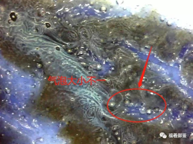 老的元青花,都是用柴木窑烧的,而现在大多仿品都是用气窑烧的,这两种工艺不同,釉质的化学变化物理变化也有所不同。特别是釉中气泡的形成过程上,它是不一样的,古代柴木窑烧的气泡要显得大小不一疏朗,气泡明亮。而现代气窑烧的气泡较细小大小相间,不透亮。这只是相对而言,也不能排除现代造假者用柴木窑仿造的器物,还得在器形、纹饰等各方面深入研究,以致判断。