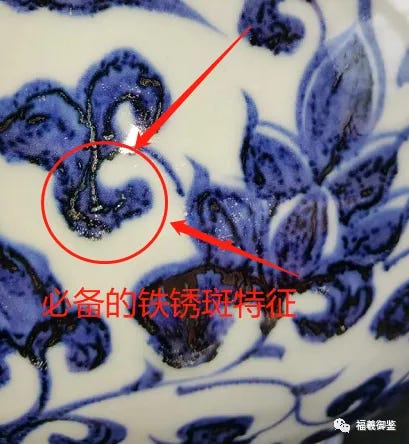 “铁锈斑”是纹饰中青料浓重处铁离子大量聚集并经二次氧化所形成的,有其特殊的分布规律。仿元青花在化学青料中添加了较多的铁元素,烧成后也会出现“:铁锈斑”,也会有闪闪“锡光”。但是,仿品的“铁锈斑”在分布上,有的太过,“铁锈斑”的密度和浓度大大超过了苏麻离青料成分中铁的含量;有的是在纹饰绘制后再用人工配制的含铁量极高的料水二次复笔点染,细心观察,就能够发现认为的制作痕迹,甚至在浅淡的青花纹饰上出现了原本不该出现的“铁锈斑”