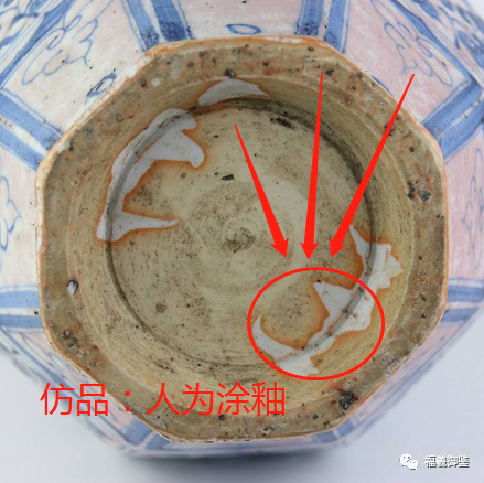 元代对器物施釉用的是蘸釉和刷釉的方法,大器如梅瓶、大罐等外部上釉用刷釉法。由于元代制瓷工艺中普遍对器底出理比较粗糙,施釉后器底往往粘釉,因此瓶,罐底部烧成后往往留下少量釉斑。现代仿品大都采用喷釉法,底部无釉。为了制造假象,就认为涂抹假釉斑。真假釉斑的区别在于:真釉斑为器身刷釉后的底部粘留物,有的器物有,有的器物没有。假釉斑往往很多,且大片存在,这就弄巧成拙,露出马脚。真釉斑是在施釉工作台面上随机沾上的,多为小片。假釉斑是刷涂的或点涂的,可明显看出人为痕迹。