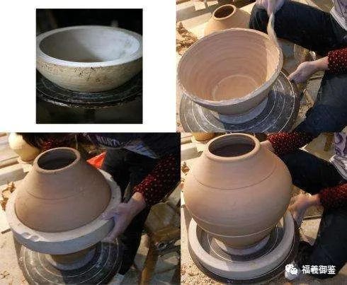 元青花琢器部分,是分断制作,大多数是为三接四部,即:颈部、腹部、底部、成型后用胎泥相接成型,但部分器物也有不接底工艺。采用湿胎接法,多见器物接口挤出胎泥,也有规整合缝接口严密,不见胎泥外液。为了保证接口的牢固性,器内挤出的胎泥不做修理,外壁修胎也有保留,因此,元代器物腹部很大部分有明显凸痕。器物内壁、底部多不施釉,大罐内防渗漏刷釉或简单荡釉。足墙多数较矮,内外斜削,有部分器底垫烧留下大小黑斑点。小件器还有垫烧留下细沙粒。