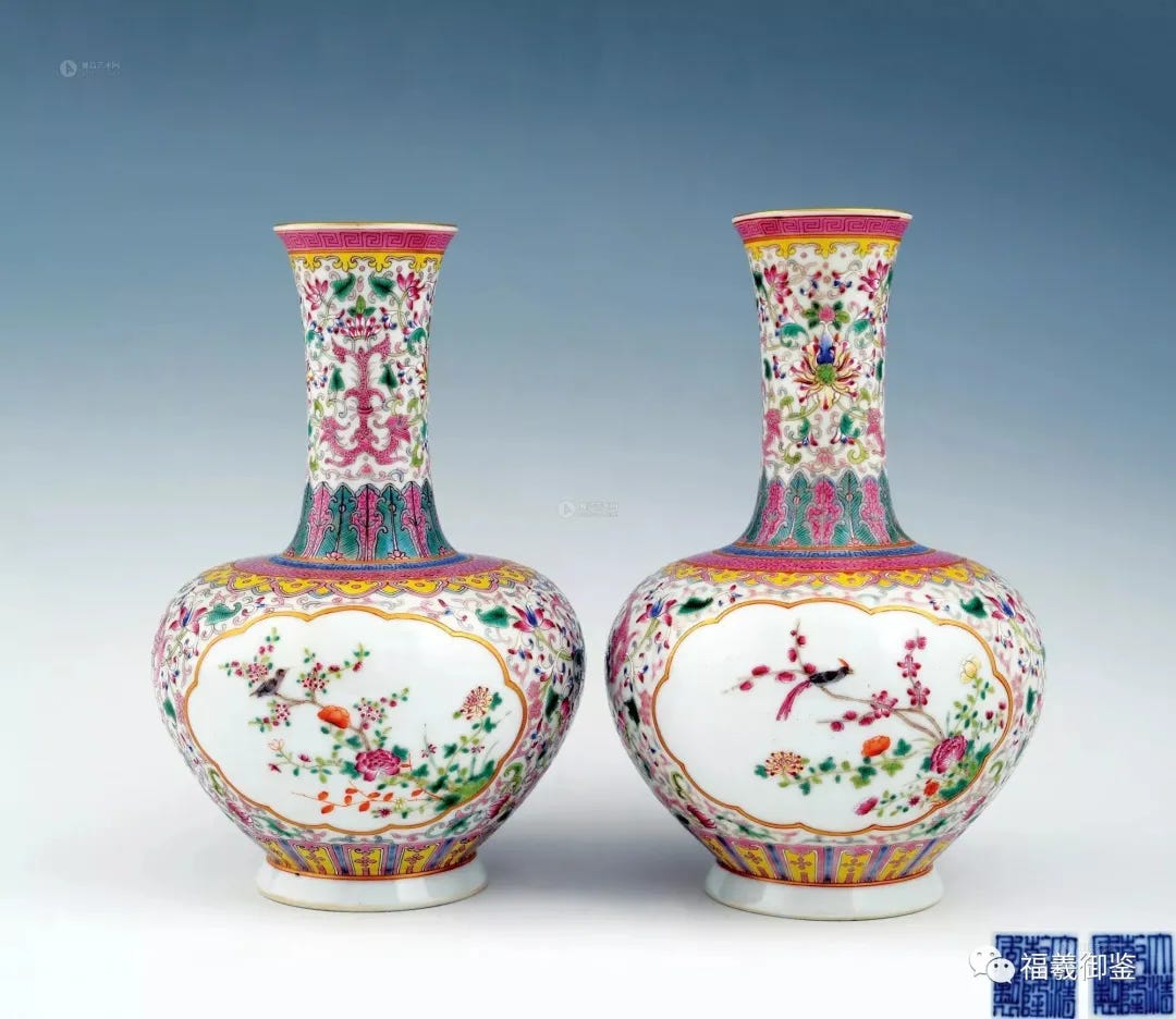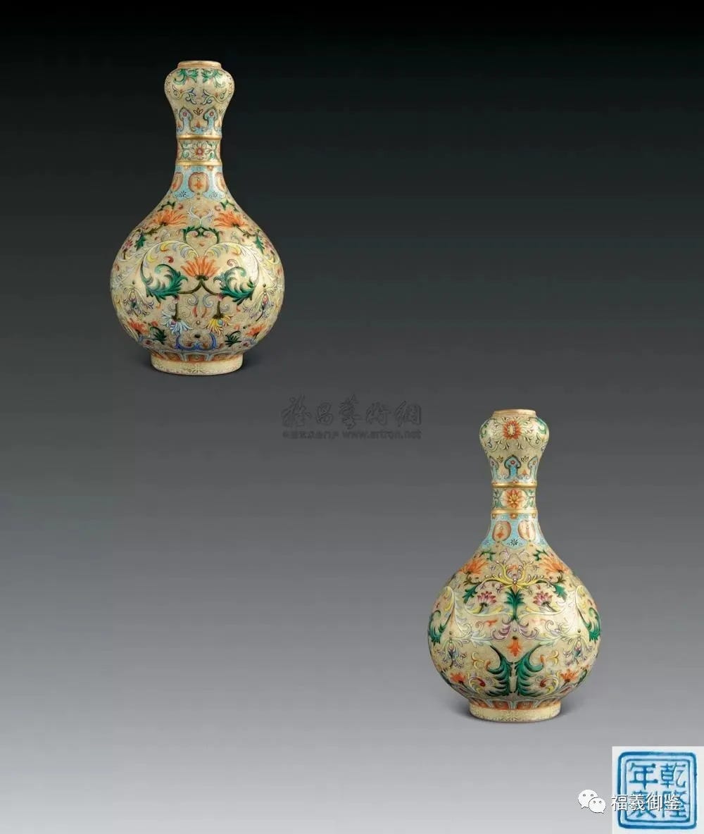 珐琅彩瓷器是由景泰蓝演变而来。景泰蓝是铜胎上珐琅釉而成,若改为瓷胎上珐琅釉则叫珐琅彩。珐琅彩起始于康熙后期,顶盛时为雍正期至乾隆期。但雍正期的珐琅彩水平最高,工艺最美。乾隆时期慢慢转向粉彩,故珐琅彩终止于乾隆后期,同时还有一部分瓷器其釉料有珐琅釉和粉彩共存。这是过渡时期的珐琅彩器,你说它是珐琅彩吗,它有粉彩,你说它是粉彩吗,它又有珐琅釉,但瓷艺水平都很高。