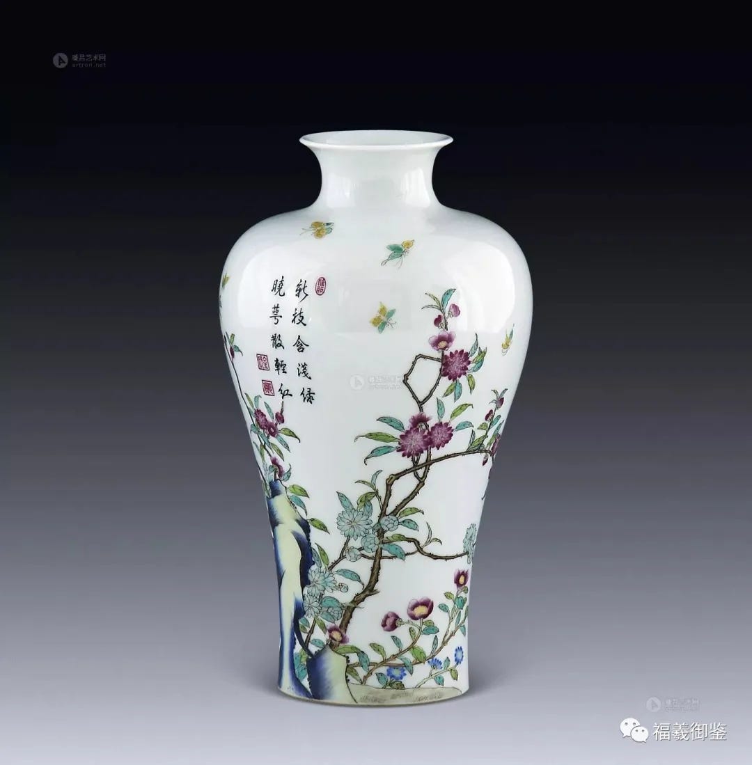 3.大多数仿者搞不清彩色、粉彩与珐琅彩的差异,只知道珐琅彩是从彩色开展而来的,可是却难脱其大红大绿的庸俗。这不是想“雅”即是能“雅”得起来的;只知道珐琅彩又开展成粉彩,却说不清两者之间的边界,更不知道珐琅彩的立体感的关键在于原料,殊不知这是更大的难题!