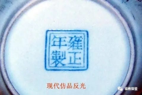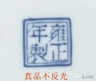 真品蓝料印章款颜色深浓沉稳,在光线的照射下不反射亮光。而仿品的蓝料印章款颜色清淡漂浮,在光线的照射下反射亮光,且字体用电脑制作,印章十分规整。这就是鉴别款式真伪的唯一诀窍!