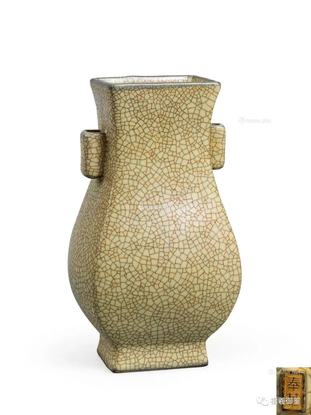 一、哥窑器必须具有众所周知的“金丝铁线”、“紫口铁足”。前者是哥窑的与众不同的裂纹,大纹为“铁线”,有的显蓝,大纹中套的小纹为“金丝”,有的不一定显金黄,大纹小纹合称为“面圾破”,它应当是密而不疏,曲而不直;后者是哥窑显露的较为特殊的胎色,但两者往往如鱼与熊掌一样不可兼得。瓷胎满釉器有“紫品”而无铁足。铁足应当是胎质本身的无釉颜色。铁足如是人为施加的一种黑色釉,其真伪值得怀疑,与《七修类稿续编》中记载的“其足皆铁色”相悖。
