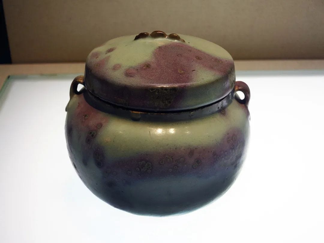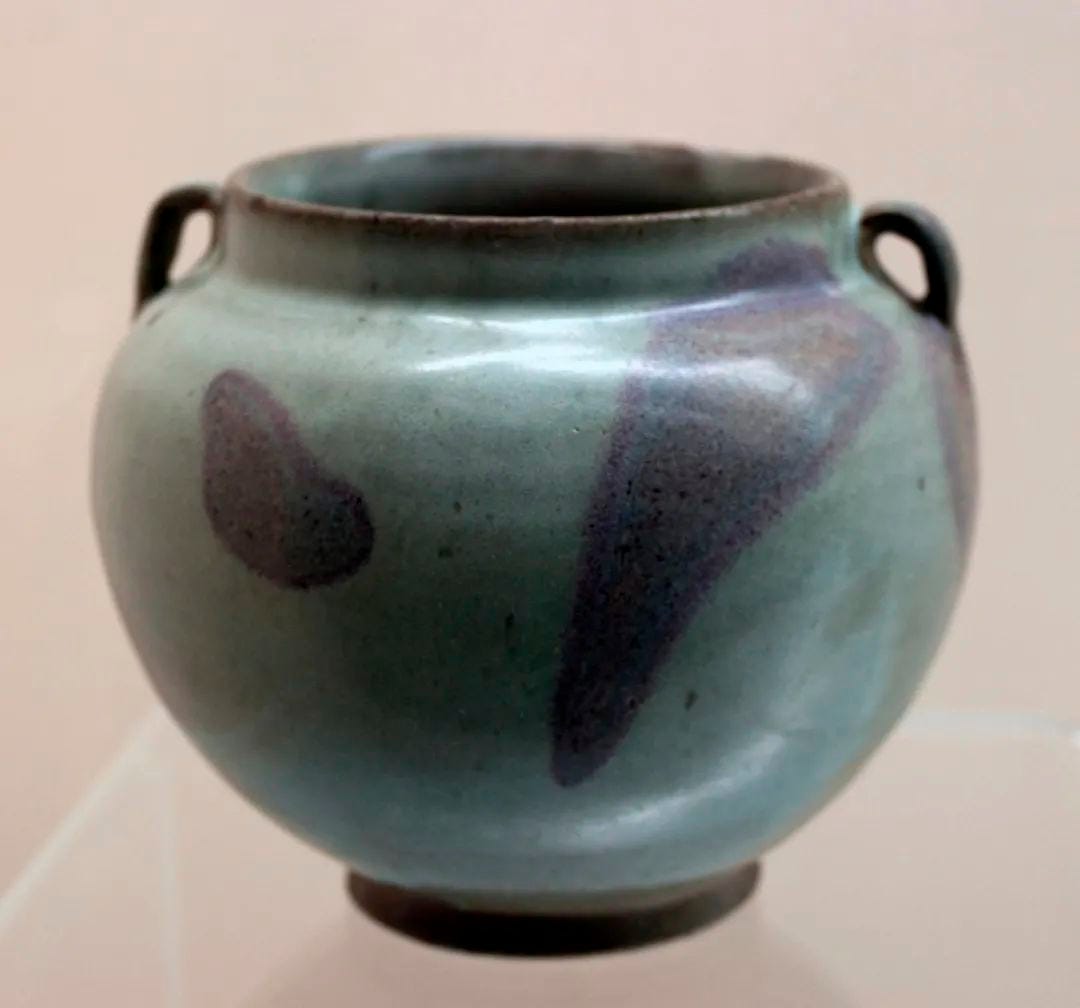 唐代魯山段店窯就已經生產出一種被稱為魯山花瓷的黑釉白斑紋瓷器,這種釉和宋金元時期的鈞窯其實是一種類型的釉,裡面都含有一定數量的五氧化二磷。這就是鈞窯與眾不同的秘密所在!圖為國博藏元鈞窯月白釉紫斑蓋罐。