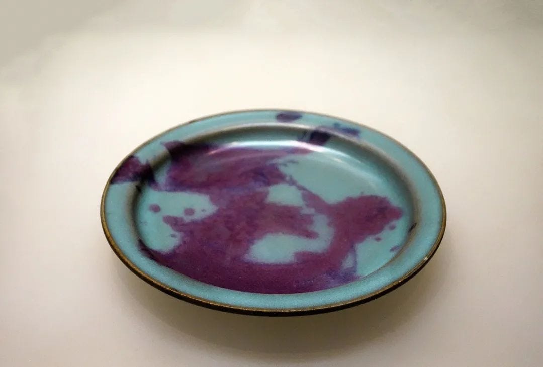 鈞瓷的釉屬於一種分相釉,也就是說,鈞瓷的釉裡有兩種玻璃相成分,一種以獨立連續不斷的小液滴的形式存在於另一種連續相中。這就是鈞窯形成乳光感的奧秘所在。圖為廣東省博物館藏宋鈞窯天青釉紫斑碟。