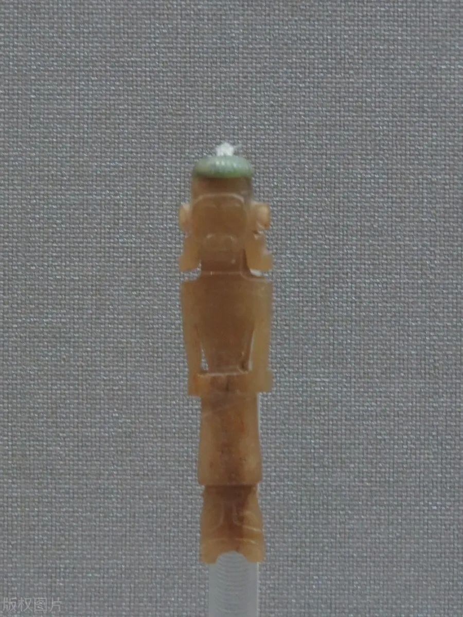 上图这件带绿帽子的玉人很有名,肉眼可见其玉材不如上一件。所以有色变。
