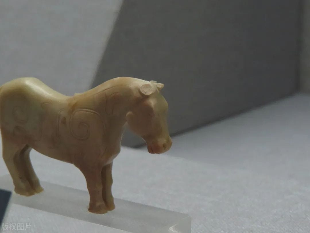 仔细看下图,山西出土的西周玉马,依旧是厚片状的。典型的蒙古矮种马,并非后世所见之大宛产汗血马的形象。
