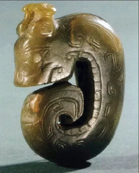 图为山东滕州前掌大货商出土的西周玉龙,社科院收藏了周时期的玉玦,龙的头顶是否有蘑菇状的角。这对玉龙,比龙头也代龙的凶恶之状,已经来了。