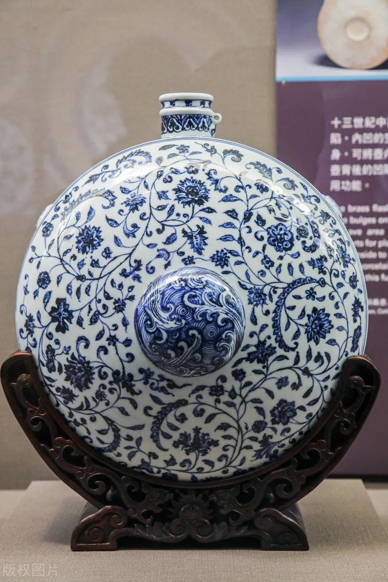 接下來看的是造型。這是鑑別瓷器永還是宣的一個關鍵點。以梅瓶為例,永樂的梅瓶比宣德梅瓶高一點,顯得秀氣,而宣德的矮胖,顯得敦厚。永宣梅瓶和元代梅瓶,洪武梅瓶的區別就更大了。對於普通收藏者而言,根本無法從器型判斷出瓷器的細微年代差別。而對於永宣青花瓷的專業研究者而言,細微的差別就能判斷出器物是否符合其所展示的年代。