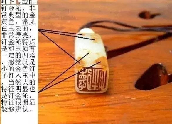 釘金沁的沁占呈釘子眼兒狀,帶色,抽坑,有棕色、紫色、灰色、黑色等,大都伴有線狀凹陷。呈灰黑色或黑色的叫釘金水銀沁。形成釘金沁至少需要1500年以上。