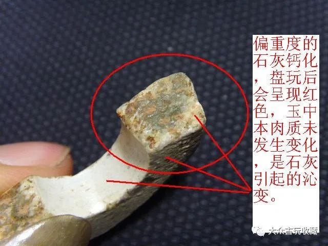 這是玉石一種變質現象,多由氧化和複分解過程而形成比較疏鬆的物質,所以較為鬆脆,怕磕碰。這種鈣化層就越厚。