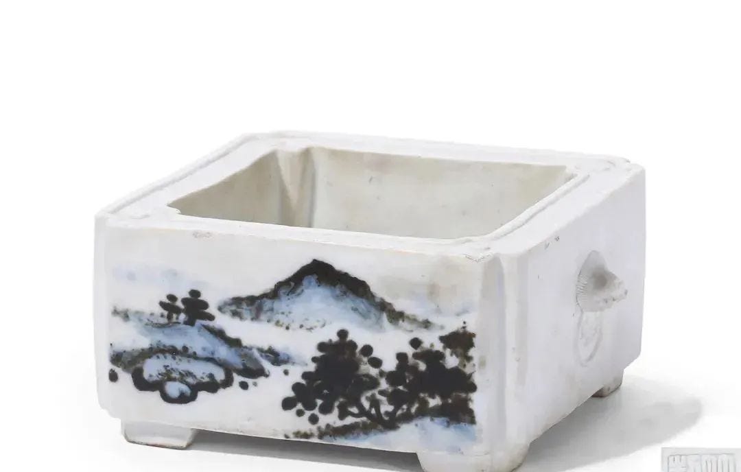 晚清青花素胎山水圖方洗