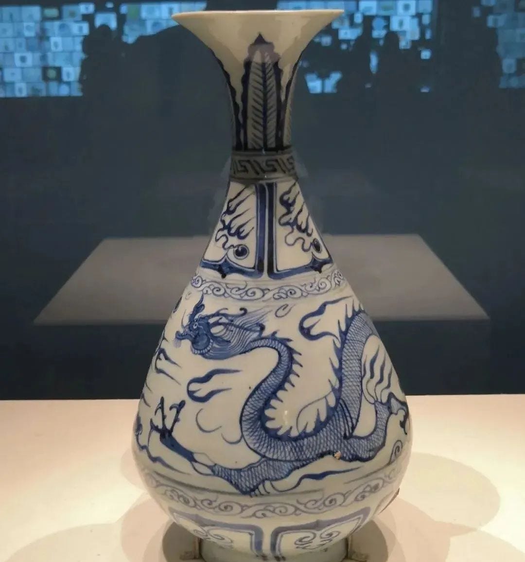 元代青花龍紋玉壺春瓶,1985年山東省青州市糧食中轉庫鐵路西側元代墓葬出土,青州市博物館藏