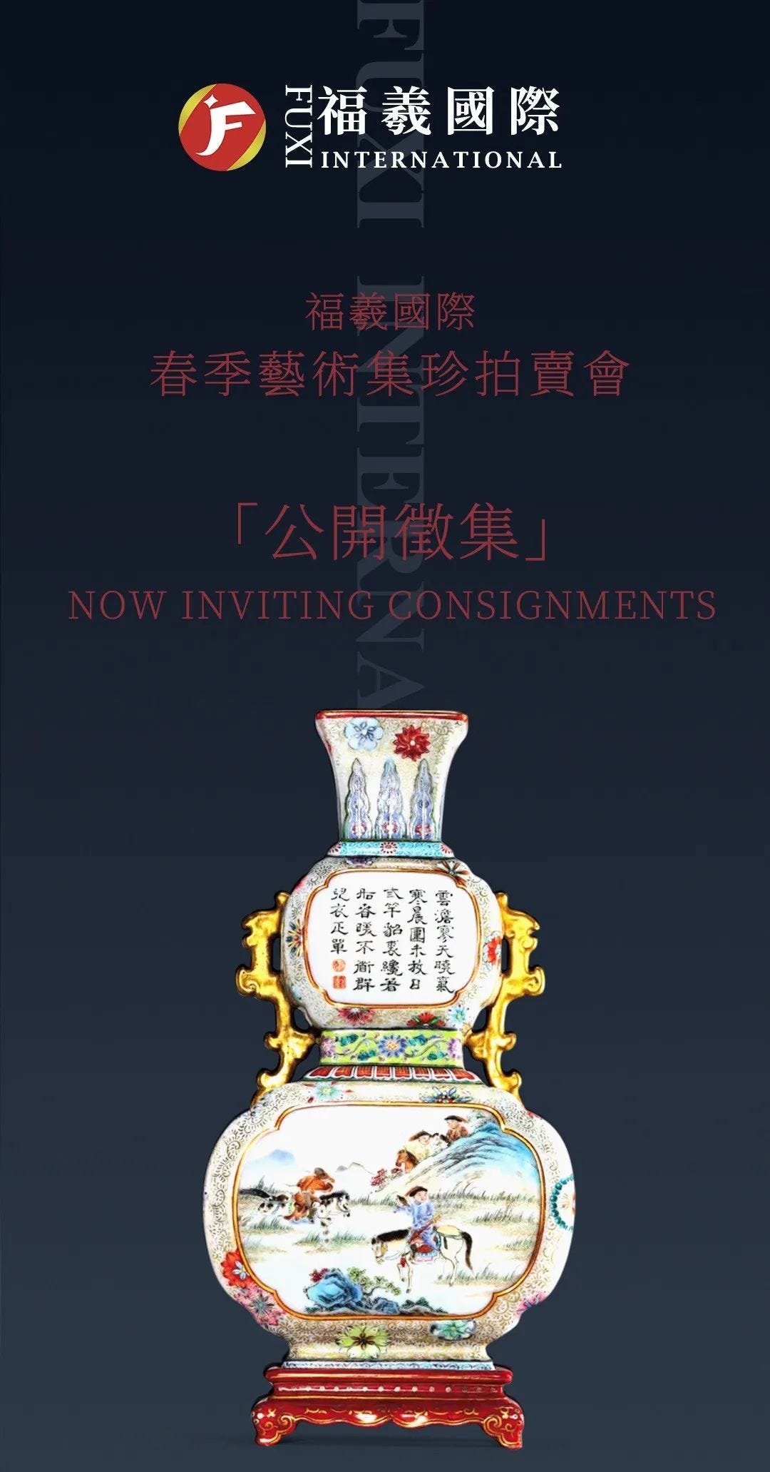 香港福羲国际拍卖公司经过1年的发展,在各组专业藏品、具体藏家和客户的鼎力支持下不俗的成绩。评估、评估市场分析、媒体、宣传推广、在集团官网雅昌推广、在官网的VIP买家产品,我们评估您的准确度、潜在的潜在客户、有潜在的买家。您只需要把其他的壹切集团随时欢迎您全心全意,用尽壹切将您藏品最好的曝光率,最高报价提及您的咨询。
