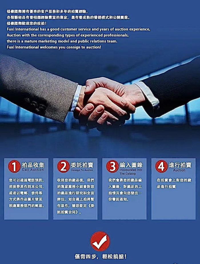 香港福羲國際拍賣公司經過11年的發展,在廣大藏家和客戶的鼎力支持下取得了不俗的成績。《福羲國際拍賣集團》專業的團隊為您的藏品,做審核、鑒定、預估、風險評估、市場分析、媒體宣傳、官網雅昌推廣、在集團眾多的VIP買家裡面,我們將為您的藏品,精淮的、針對性的、找到有意向的買家。您只需把最好的精品帶給集團,其他的壹切 集團將全心全意,用盡壹切渠道將您藏品的曝光率,成交率提到最高,福羲國際隨時歡迎您的咨詢。